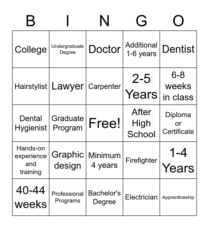 This bingo card has a free space and 28 words: 1-4 Years, Journeyperson, 2-5 Years, Electrician, Hairstylist, Doctor, Undergraduate Degree, Hands-on experience and training, After High School, 40-44 weeks, Dental Hygienist, Additional 1-6 years, Professional Programs, Bachelor's Degree, 6-8 weeks in class, Military programs, Graphic design, Lawyer, Carpenter, Minimum 4 years, College, University, Apprenticeship, Graduate Program, Diploma or Certificate, Firefighter, Dentist and welder.