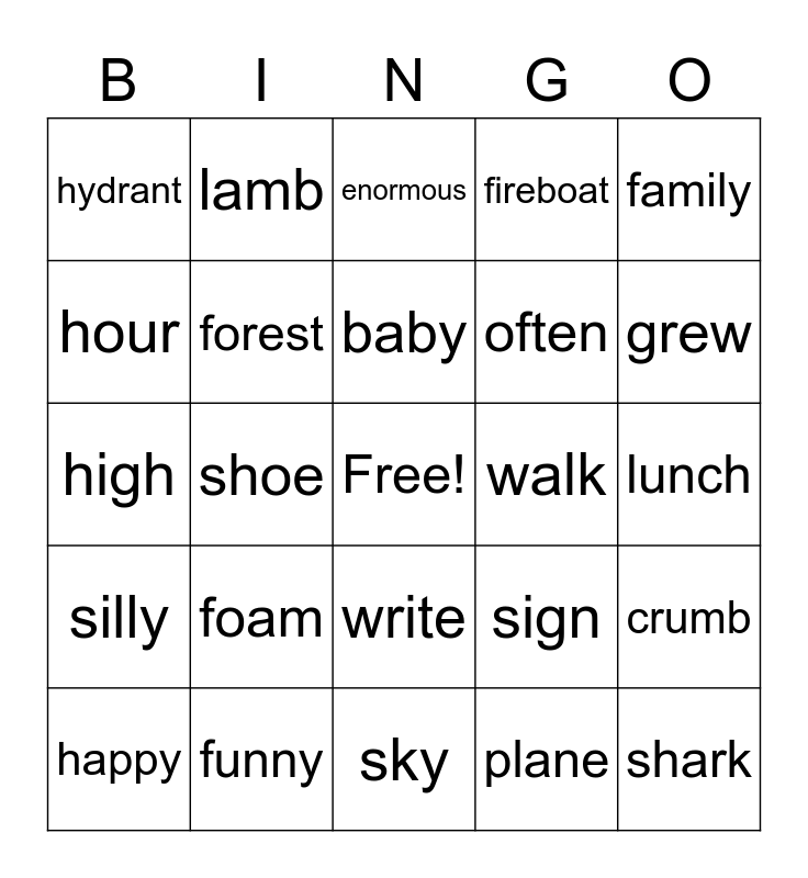 This bingo card has a free space and 25 words: foam, sky, baby, happy, family, hydrant, hour, lamb, walk, write, often, high, sign, crumb, forest, broken, lunch, enormous, grew, shoe, shark, funny, silly, fireboat and plane.