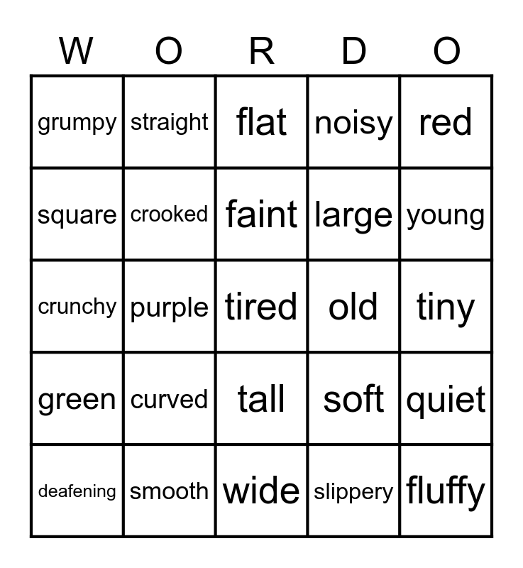 This bingo card has 30 words: smooth, round, purple, narrow, grumpy, flat, crooked, tall, old, wide, tiny, tired, slippery, fluffy, young, short, soft, green, curved, red, crunchy, blue, straight, large, square, noisy, quiet, deafening, faint and confused.