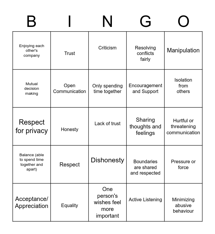 This bingo card has 34 words: Talking openly about problems, Safety, Fighting or avoidance of issues, Compromise, Hurtful or threatening communication, Mutual decision making, Open Communication, Lack of trust, Encouragement and Support, Minimizing abusive behaviour, Respect for privacy, Trust, Active Listening, Imbalance of power and control, Balance (able to spend time together and apart), Honesty, Dishonesty, Sharing thoughts and feelings, Pressure or force, Acceptance/ Appreciation, Equality, One person's wishes feel more important, Resolving conflicts fairly, Isolation from others, Independence, Respect, Criticism, Listening without judgement, Manipulation, Enjoying each other's company, Empathy, Only spending time together, Boundaries are shared and respected and Fear.
