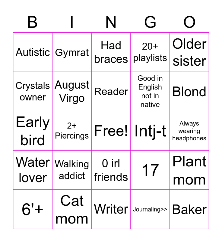 This bingo card has a free space and 24 words: Walking addict, Cat mom, Reader, 6'+, Older sister, Autistic, Crystals owner, Gymrat, Intj-t, 0 irl friends, Good in English not in native, Early bird, 17, Plant mom, August Virgo, Journaling>>, Always wearing headphones, Had braces, Blond, 2+ Piercings, Baker, Water lover, 20+ playlists and Writer.