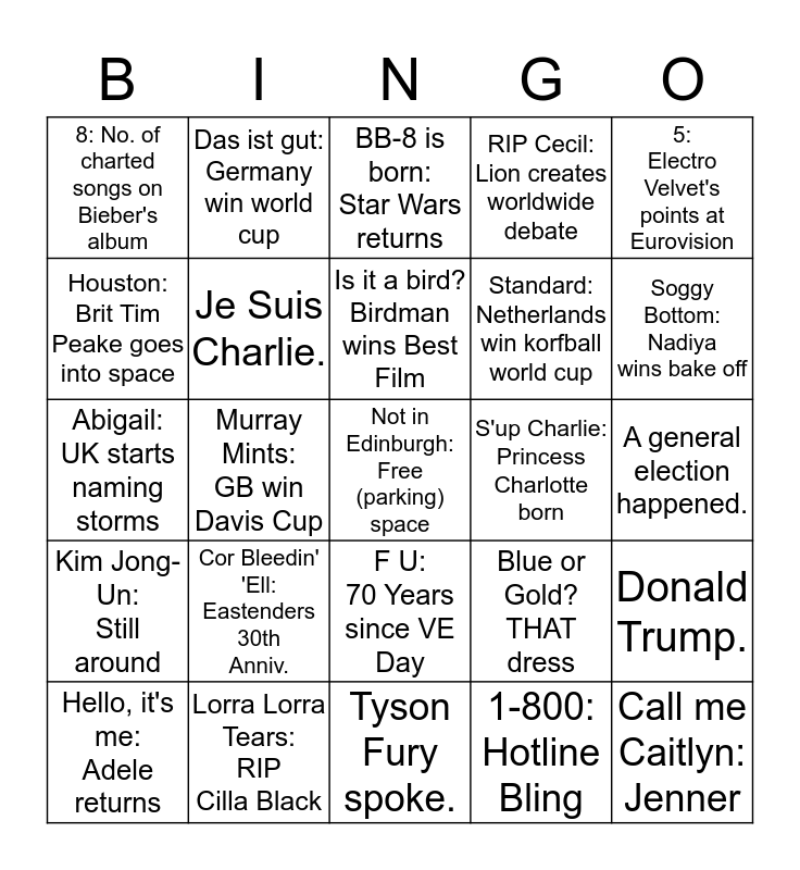This bingo card has a free space and 24 words: Cor Bleedin' 'Ell: Eastenders 30th Anniv., Lorra Lorra Tears: RIP Cilla Black, Is it a bird? Birdman wins Best Film, Hello, it's me: Adele returns, 5: Electro Velvet's points at Eurovision, 8: No. of charted songs on Bieber's album, Houston: Brit Tim Peake goes into space, Das ist gut: Germany win world cup, S'up Charlie: Princess Charlotte born, F U: 70 Years since VE Day, Standard: Netherlands win korfball world cup, Abigail: UK starts naming storms, Blue or Gold? THAT dress, Donald Trump., Je Suis Charlie., 1-800: Hotline Bling, A general election happened., BB-8 is born: Star Wars returns, Soggy Bottom: Nadiya wins bake off, Murray Mints: GB win Davis Cup, Call me Caitlyn: Jenner, Kim Jong-Un: Still around, RIP Cecil: Lion creates worldwide debate and Tyson Fury spoke..