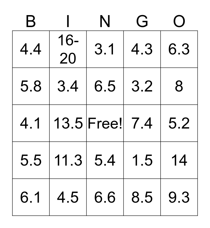 This bingo card has a free space and 40 words: 2.9, 4.1, 4.9, 3.4, 4.5, 5.4, 6.5, 3.7, 6.3, 5.5, 13.5, 4.3, 9.3, 5.2, 7.4, 11.3, 4.8, 4.4, 3.8, 3.1, 14, 8.5, 3.2, 5.8, 9.1, 6.8, 8.4, 8.2, 8.3, 8.1, 1.3, 6.1, 15.3, 1.5, 8, 6.6, 16.8, 2.7, 16-20 and 4.
