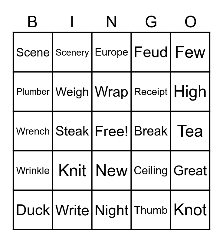 This bingo card has a free space and 24 words: Knit, Write, Wrap, Duck, Few, Scene, Plumber, Scenery, Break, New, Receipt, Wrench, Ceiling, Great, Weigh, Thumb, Tea, Europe, High, Steak, Knot, Wrinkle, Feud and Night.