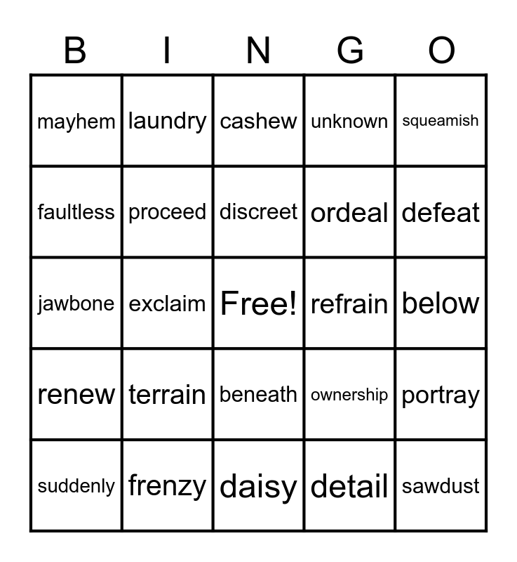 This bingo card has a free space and 24 words: terrain, frenzy, discreet, suddenly, squeamish, mayhem, faultless, laundry, refrain, beneath, ordeal, jawbone, ownership, portray, proceed, detail, below, cashew, defeat, exclaim, sawdust, renew, unknown and daisy.