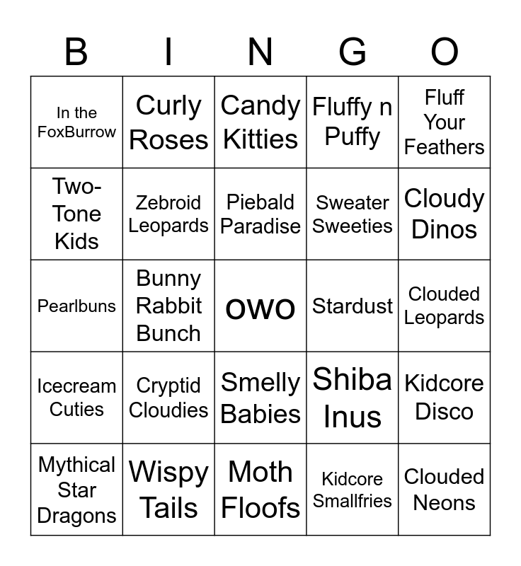 This bingo card has a free space and 109 words: Rainbow, Pink Lemonade, Stardust, Magical Mews, Fairy Tigers, Toast & Jelly Jars, Flower Friends, Teapot Kittens, Alien Cats, Pocky Parade, Mermaid Calikois, Honeebears, Boba Cloudies, Lil Leopard Loafs, Meowin Monsties, Bubble Sharks, Pearlbuns, Punky Leopards, Orb Weavers, Chimeras, Kidcore Disco, Winged Rams, Candy Kitties, Piebald Paradise, Rainbow, Piebald Paradise, Fluff Your Feathers, Flower Friends, Tied Up with a Bow, Firewalkers, Cloudy Dinos, Fluffy n Puffy, Candy Kitties, Demon Leopards, Angel or Devol, Clouded Neons, Mushroom Mania, Lovecore Leopards, Wispy Tails, Angel Fries, Rainbow Randoms, Lunar Water Tigers, Sweater Sweeties, Bunny Rabbit Bunch, Shiba Inus, Kidcore Disco, Cloudy Days, Cupid Kitties, Tailmouth Cloudies, Pink Lemonade, Dreamlites, Super Sparkly Galaxy, Kidcore Smallfries, Magical Mews, Pocky Parade, Space CHAOS, Rainbow of RedPandas, Boba Cloudies, Shamrock Specials, Zebroid Leopards, In the FoxBurrow, Sectioned Tails, Angel Bunnies, Lollipop Bears, Bright Snail Leps, Sabertooth Leopards, Ibby Bibby Sheep, Trans Visibility Day, Welcome to Thneedville, Pink Cookies, Fluffbean Babies, Curly Roses, Icecream Cuties, Axolotl Leopards, Donut Days, Pride Parade, Clouded Leopards, Bathtime Buddies, Fireworks, Wings and Horns, Fennec Foxes, Corgifries, Floral Frenzy, Claw Machine Cloudies, WhipTails, Spiked Collars, Lil Leopard Loafs, Toast and Jelly Jars, Two-Tone Kids, Orb Weavers, Punky Leopards, Cryptid Cloudies, Winged Faun, Mermaid Calikois, Meowin Monsties, Winged Rams, Grand Raffle, Simples Best, Moth Floofs, Long Stars, Armadillos, Legend Leopards, Mythical Star Dragons, Smelly Babies, Oh Worm, Love All Around, Chimeras, Honeebears and Pearlbuns.