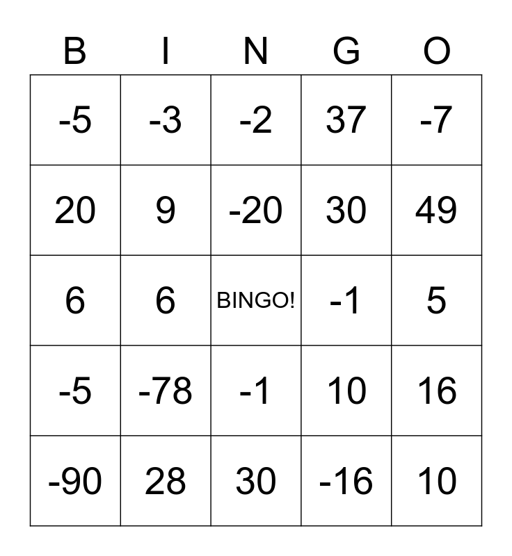This bingo card has a free space and 24 words: -90, -78, -20, -16, -7, -5, -3, -2, -1, 5, 6, 9, 10, 16, 20, 28, 30, 37, 49, -5, 6, -1, 30 and 10.