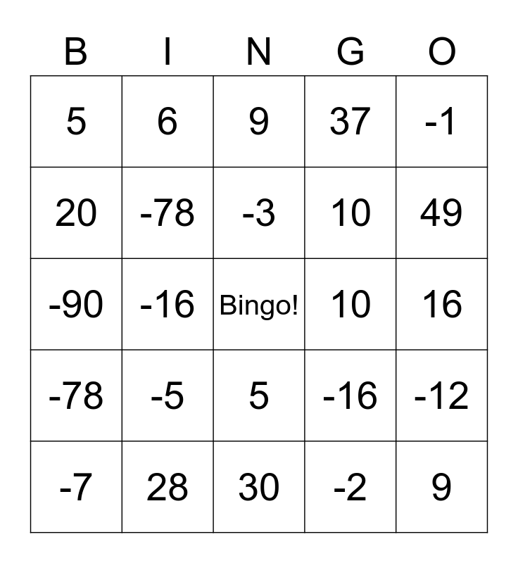 This bingo card has a free space and 24 words: -7, -5, -3, -2, -1, 5, 6, 9, 10, 16, -90, -78, -16, -12, 20, 28, 30, 37, 49, -78, -16, 5, 10 and 9.