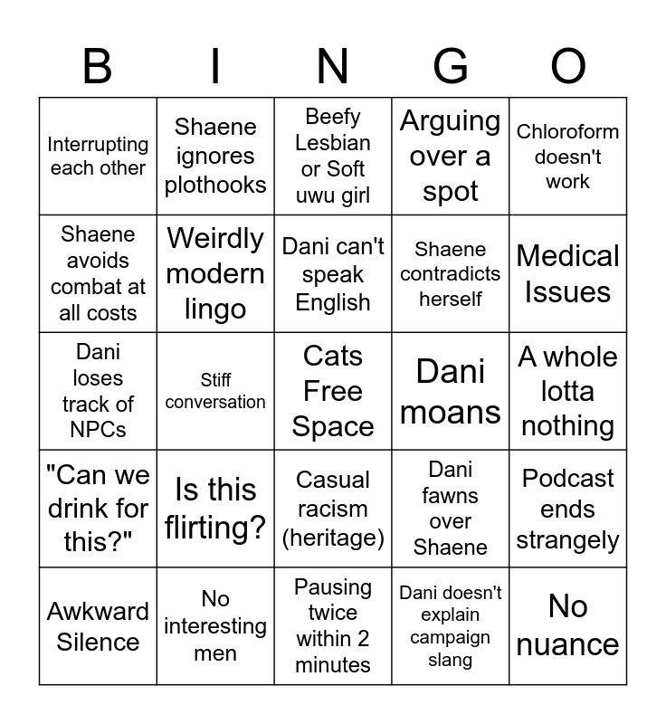 This bingo card has a free space and 24 words: Is this flirting?, No interesting men, Dani can't speak English, Awkward Silence, Chloroform doesn't work, Interrupting each other, Shaene avoids combat at all costs, Shaene ignores plothooks, Dani moans, Casual racism (heritage), Shaene contradicts herself, Dani loses track of NPCs, Dani fawns over Shaene, Podcast ends strangely, Weirdly modern lingo, Dani doesn't explain campaign slang, A whole lotta nothing, Beefy Lesbian or Soft uwu girl, Medical Issues, Stiff conversation, No nuance, "Can we drink for this?", Arguing over a spot and Pausing twice within 2 minutes.