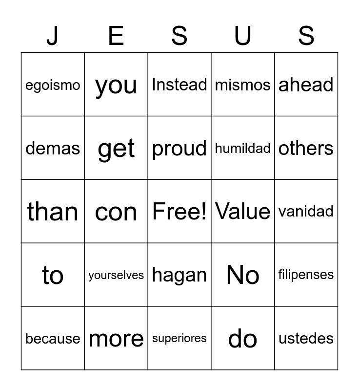 This bingo card has a free space and 34 words: Dont, do, anything, only, to, get, ahead, because, you, are, proud, Instead, be, humble, Value, others, more, than, yourselves, No, hagan, nada, egoismo, vanidad, superiores, ustedes, mismos, consideren, humildad, demas, como, con, filipenses and philippians.