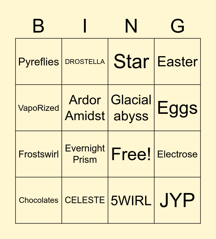 This bingo card has 19 words: Free!, Idol, Star, JYP, Electrose, VapoRized, 5WIRL, Pyreflies, DROSTELLA, Frostswirl, Evernight Prism, Ardor Amidst, Glacial abyss, CELESTE, Chocolates, Bunny, Easter, Eggs and Hailisa.