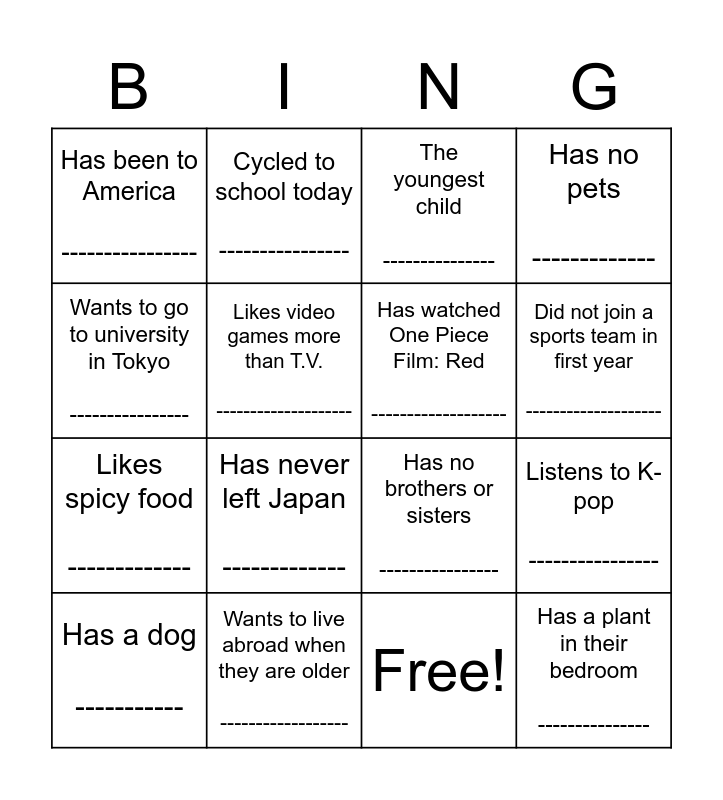 This bingo card has 17 words: Free!, Has a dog -----------, The youngest child ---------------, Has been to America ----------------, Has never left Japan -------------, Has no pets -------------, Listens to K-pop ----------------, Has watched One Piece Film: Red -------------------, Did not join a sports team in first year --------------------, Likes video games more than T.V. --------------------, Wants to live abroad when they are older ------------------, Has no brothers or sisters ----------------, Wants to go to university in Tokyo ----------------, Cycled to school today ----------------, Likes spicy food -------------, Goes to Starbucks every week ---------------- and Has a plant in their bedroom ---------------.