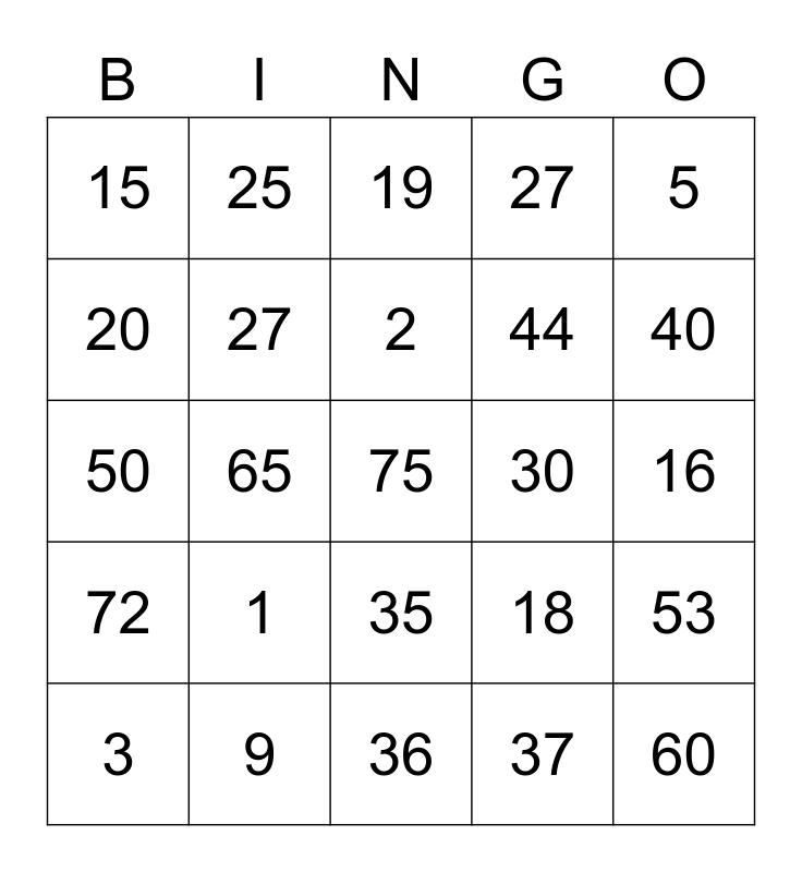 This bingo card has a free space and 24 words: 1, 9, 2, 3, 5, 15, 20, 25, 30, 35, 44, 50, 18, 53, 27, 37, 16, 19, 40, 65, 60, 72, 27 and 36.