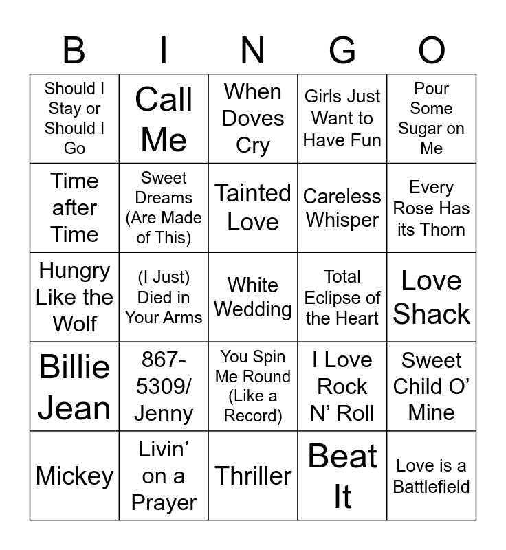 This bingo card has a free space and 59 words: Eye of the Tiger, Livin’ on a Prayer, Every Breath You Take, Take on Me, Sweet Child O’ Mine, Don’t You (Forget About Me), Sweet Dreams (Are Made of This), Another One Bites the Dust, Total Eclipse of the Heart, Come on Eileen, Time after Time, I Wanna Dance with Somebody (Who Loves Me), Careless Whisper, Wake Me Up Before you Go-Go, Don’t You Want Me, Call Me, Tainted Love, Girls Just Want to Have Fun, Jump, Hungry Like the Wolf, (I Just) Died in Your Arms, When Doves Cry, Kids in America, Love Shack, Jessie’s Girl, Karma Chameleon, You Spin Me Round (Like a Record), Jack and Diane, Pour Some Sugar on Me, Push It, Like a Prayer, Crazy Little Thing Called Love, Addicted to Love, Here I Go Again, Should I Stay or Should I Go, In the Air Tonight, Physical, I Love Rock N’ Roll, Flashdance… What a Feeling, Billie Jean, Hurts So Good, Thriller, Beat It, Maneater, What’s Love Got to Do With It, It’s Still Rock and Roll to Me, Faith, Straight Up, Every Rose Has its Thorn, Mickey, I Want to Know Love Is, Who Can It Be Now?, Maniac, Love is a Battlefield, Under Pressure, 867-5309/ Jenny, Fight For Your Right, Word Up! and Black Velvet.