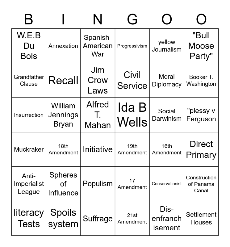 This bingo card has 48 words: Immigration Act of 1924, Insurrection, poll tax, 16th Amendment, Social Darwinism, 17 Amendment, Annexation, Referendum, "Bull Moose Party", Spoils system, Grandfather Clause, Progressivism, 18th Amendment, Muckraker, Settlement Houses, Populism, Recall, William Jennings Bryan, Free!, yellow Journalism, Booker T. Washington, Direct Primary, W.E.B Du Bois, Jim Crow Laws, Jingoism, Civil Service, Initiative, Defamation, "plessy v Ferguson, Ida B Wells, Ida Tarbell, Spheres of Influence, Dis- enfranch isement, Imperialism, 19th Amendment, Suffrage, 21st Amendment, Alfred T. Mahan, literacy Tests, Jacob Riis, Conservationist, Anti-Imperialist League, Spanish-American War, Roosevelt Corollary, Moral Diplomacy, Dollar Diplomacy, Construction of Panama Canal and Big Stick Diplomacy.