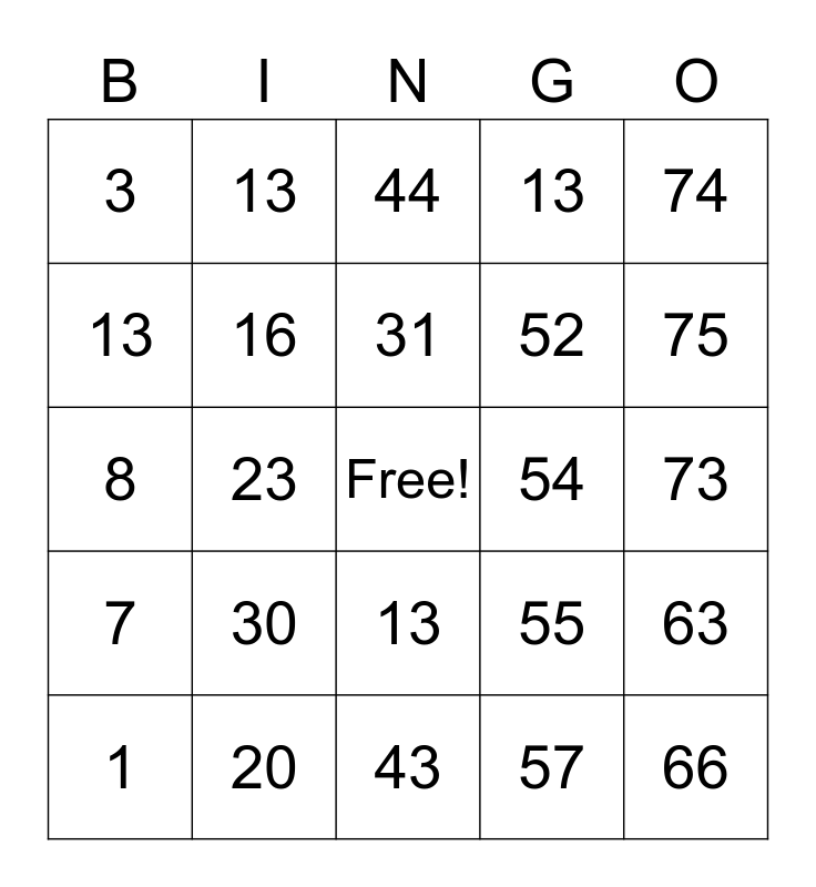 This bingo card has a free space and 29 words: 13, 20, 44, 48, 74, 3, 16, 31, 54, 63, 1, 23, 57, 66, 8, 17, 43, 55, 75, 7, 30, 34, 52, 73, 13, 13, 13, 13 and 13.