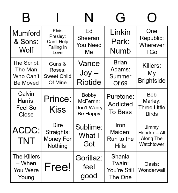This bingo card has 30 words: Free!, ACDC: Shook Me All Night Long, Prince: Kiss, Paolo Nutini: New Shoes, Mumford & Sons: Wolf, Ed Sheeran: You Need Me, Guns & Roses: Sweet Child Of Mine, Sublime: What I Got, Puretone: Addicted To Bass, Gorillaz: feel good, Bob Marley: Three Little Birds, Bobby McFerrin: Don’t Worry Be Happy, Shania Twain: You're Still The One, Oasis: Wonderwall, Killers: My Brightside, Foo Fighter: Times Like These, Iron Maiden: Run to the Hills, ACDC: TNT, Dire Straights: Money For Nothing, One Republic: Wherever I Go, Calvin Harris: Feel So Close, Cage The Elephant: Ain't No Rest For The Wicked, Elvis Presley: Can’t Help Falling In Love, Brian Adams: Summer Of 69, The Script: The Man Who Can’t Be Moved, Linkin Park: Numb, Jimmy Hendrix – All Along The Watchtower, The Killers – When You Were Young, Vance Joy – Riptide and Outcast – Hey Ya.