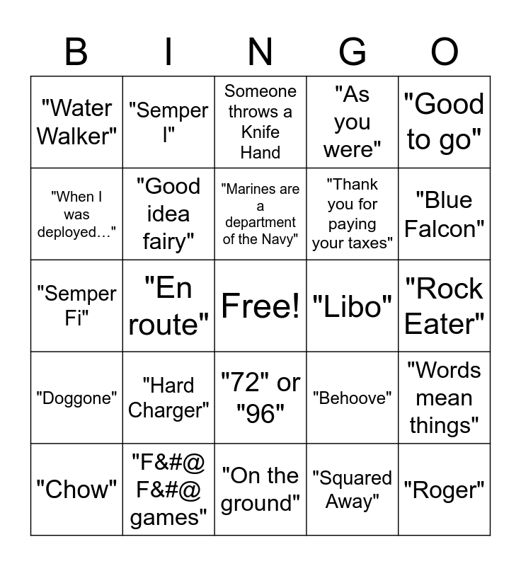 This bingo card has a free space and 44 words: "Tracking", "Roger", "High Speed, Low Drag", "Chow", "Grog", "Squared Away", Someone throws a Knife Hand, "Un-F&#@ Yourself", "Good to go", "F&#@ F&#@ games", "As you were", "Libo", "72" or "96", "Hard Charger", "F&#@ your feelings", "On the ground", "Boots running", "Semper Fi", Marines making guttural noises, "Blue Falcon", "Semper I", "Sarn't" or "Terminal Lance", "Pending any questions", "Water Walker", "Window Licker", "Rock Eater", "Diddle diddle, Marines up the middle", "Mouth breather", "Behoove", "Doggone", "Ninja Punch", "Words mean things", "See what happened was", "Right?", "En route", "If you're early you're on time, if you're on time you're late", "Oorah" / "Hooyah" / "Hoo-Ah", Someone makes fun of the (Ch)Air Force, "Marines are a department of the Navy", "When I was deployed…", "Thank you for paying your taxes", "Thank me for my service", "Good idea fairy" and Someone complains about their commanding officers.