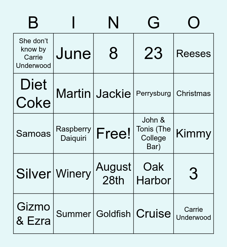 This bingo card has a free space and 51 words: Jean, Carrie Underwood, Pink, Goldfish, Winery, Highschool, June, Jackie Blue Martin, Diet Coke, Ohio Northern University, Martin, 23, 3, Oak Harbor, Oaf, Redsocks, Jackie, John & Tonis (The College Bar), Peanut butter & Chocolate, Reeses, Raspberry Daiquiri, Cruise, She don’t know by Carrie Underwood, Perrysburg, Fearless, The Grinch, Christmas, Harry Potter Books, Gizmo & Ezra, 8, 3, Youngest, Promedica, 9/12, Texas Roadhouse, Summer, 2022, 6 Semesters, How I met your Mother, Virgo, Kimmy, Silver, Greece, 1 year old, 16, Hippo, Samoas, Daycare, 5, August 28th and 2.