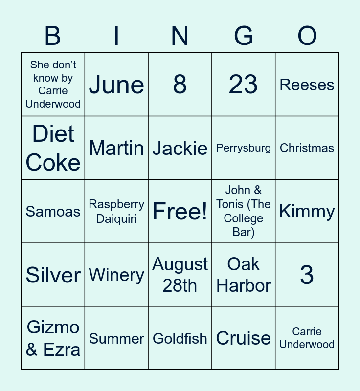 This bingo card has a free space and 51 words: Jean, Carrie Underwood, Pink, Goldfish, Winery, Highschool, June, Jackie Blue Martin, Diet Coke, Ohio Northern University, Martin, 23, 3, Oak Harbor, Oaf, Redsocks, Jackie, John & Tonis (The College Bar), Peanut butter & Chocolate, Reeses, Raspberry Daiquiri, Cruise, She don’t know by Carrie Underwood, Perrysburg, Fearless, The Grinch, Christmas, Harry Potter Books, Gizmo & Ezra, 8, 3, Youngest, Promedica, 9/12, Texas Roadhouse, Summer, 2022, 6 Semesters, How I met your Mother, Virgo, Kimmy, Silver, Greece, 1 year old, 16, Hippo, Samoas, Daycare, 5, August 28th and 2.