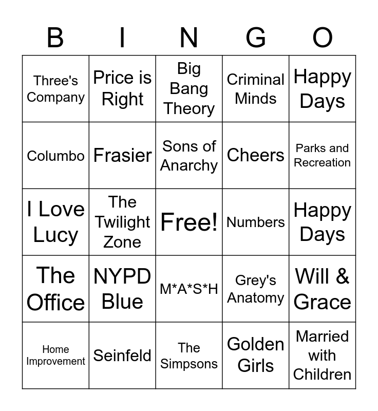 This bingo card has a free space and 54 words: Game of Thrones, The Office, Burn Notice, Psych, M*A*S*H, Lost, Criminal Minds, The Brady Bunch, Columbo, Friends, Three's Company, House, Seinfeld, Home Improvement, Law & Order, The Simpsons, Married with Children, Cheers, The Beverly Hillbillies, Happy Days, Grey's Anatomy, Blue Bloods, Numbers, Happy Days, Gilligan's Island, Price is Right, Family Feud, Jeopardy, Wheel of Fortune, Golden Girls, I Love Lucy, Muppet Show, The Flintstones, Modern Family, Big Bang Theory, Scrubs, I Love Lucy, Will & Grace, Star Trek, Frasier, Murder She Wrote, ER, Knight Rider, Breaking Bad, NYPD Blue, Quantum Leap, Yellowstone, Stranger Things, Sons of Anarchy, The Twilight Zone, Parks and Recreation, Saturday Night Live, Gilmore Girls and The Walking Dead.