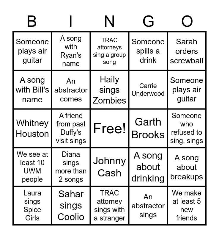 This bingo card has a free space and 24 words: Diana sings more than 2 songs, Sahar sings Coolio, Haily sings Zombies, Laura sings Spice Girls, Sarah orders screwball, Someone plays air guitar, A song with Bill's name, A song with Ryan's name, Garth Brooks, Johnny Cash, Carrie Underwood, Whitney Houston, A song about drinking, A song about breakups, An abstractor comes, An abstractor sings, Someone who refused to sing, sings, TRAC attorneys sing a group song, Someone plays air guitar, A friend from past Duffy's visit sings, We make at least 5 new friends, We see at least 10 UWM people, Someone spills a drink and TRAC attorney sings with a stranger.