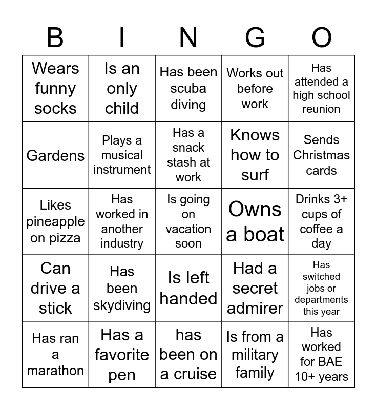 This bingo card has a free space and 47 words: Buys lunch every day, Has worked for BAE 10+ years, Has planned a work party, has been on a cruise, Has been skydiving, Has won an eating competition, Is an only child, Has a bucket list, Gardens, Has visited 4+ continents, Plays a musical instrument, Works out before work, Has switched jobs or departments this year, Had a secret admirer, Has started a business, Is an extrovert, Has a snack stash at work, Owns a boat, Can Hula Hoop, Has attended a high school reunion, Has worked in another industry, Is from a military family, Wears funny socks, Knows how to surf, Owns an exotic pet, Sends Christmas cards, Has ran a marathon, Belongs to a club, Is left handed, Can drive a stick, Has the same birthday month as you, Has a phobia, Has broken a bone, Is a part of a professional group, Loves true crime shows, Has a favorite pen, Drinks 3+ cups of coffee a day, Has worked at a family owned business, Has a scar, Has ridden in a hot air balloon, Has met a celebrity, Has been scuba diving, Likes pineapple on pizza, Has received an award, Has food allergies, Gardens and Has a dog.