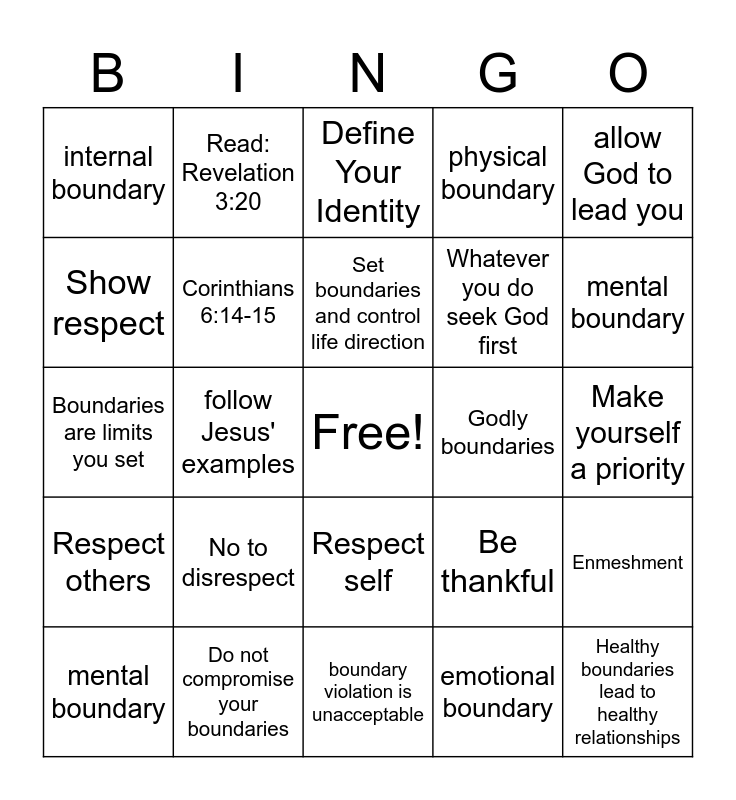 This bingo card has a free space and 42 words: obedience, follow Jesus' examples, NO to boundary violation, Jeremiah 5:22-23 & 25, Healthy boundaries lead to healthy relationships, Boundaries are limits you set, Do not compromise your boundaries, Protect your finest personal asset, physical boundary, Make yourself a priority, Show respect, No to disrespect, Be thankful, mental boundary, mental boundary, Have you no respect for me?, unmovable boundary, Godly boundaries, Say what you mean and mean what you say, internal boundary, Corinthians 6:14-15, Respect self, personal space, allow God to lead you, Preserve your purpose and mission, Healthy boundaries - mutual respect between individuals, Define Your Identity, Self Love everytime, Set boundariesblock stress and chaos, Respect others, Be assertive, Set boundaries and control life direction, Whatever you do seek God first, Enmeshment, Protect Yourself from the Control of Others, Protect yourself from violators, boundary violation is unacceptable, emotional boundary, Be true to self, Self-awareness, Read: Revelation 3:20 and No means No.