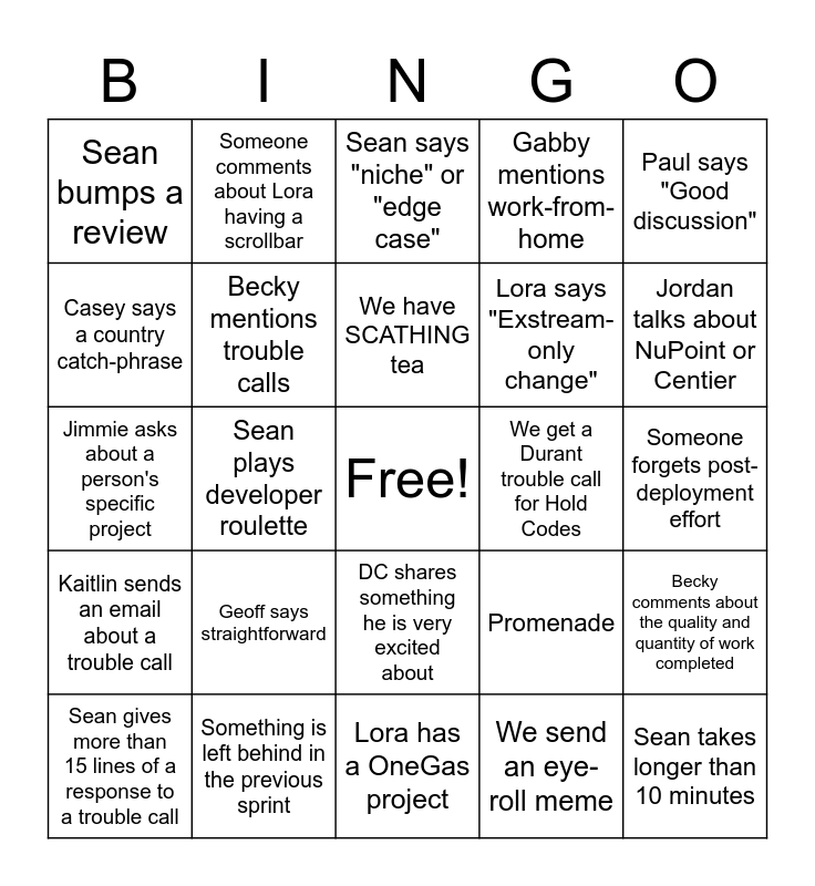 This bingo card has a free space and 24 words: Geoff says straightforward, Something is left behind in the previous sprint, We have SCATHING tea, Sean gives more than 15 lines of a response to a trouble call, Paul says "Good discussion", Sean bumps a review, Casey says a country catch-phrase, Someone comments about Lora having a scrollbar, We get a Durant trouble call for Hold Codes, DC shares something he is very excited about, Lora says "Exstream-only change", Jimmie asks about a person's specific project, Promenade, Becky comments about the quality and quantity of work completed, Becky mentions trouble calls, We send an eye-roll meme, Someone forgets post-deployment effort, Sean says "niche" or "edge case", Jordan talks about NuPoint or Centier, Sean plays developer roulette, Sean takes longer than 10 minutes, Kaitlin sends an email about a trouble call, Gabby mentions work-from-home and Lora has a OneGas project.