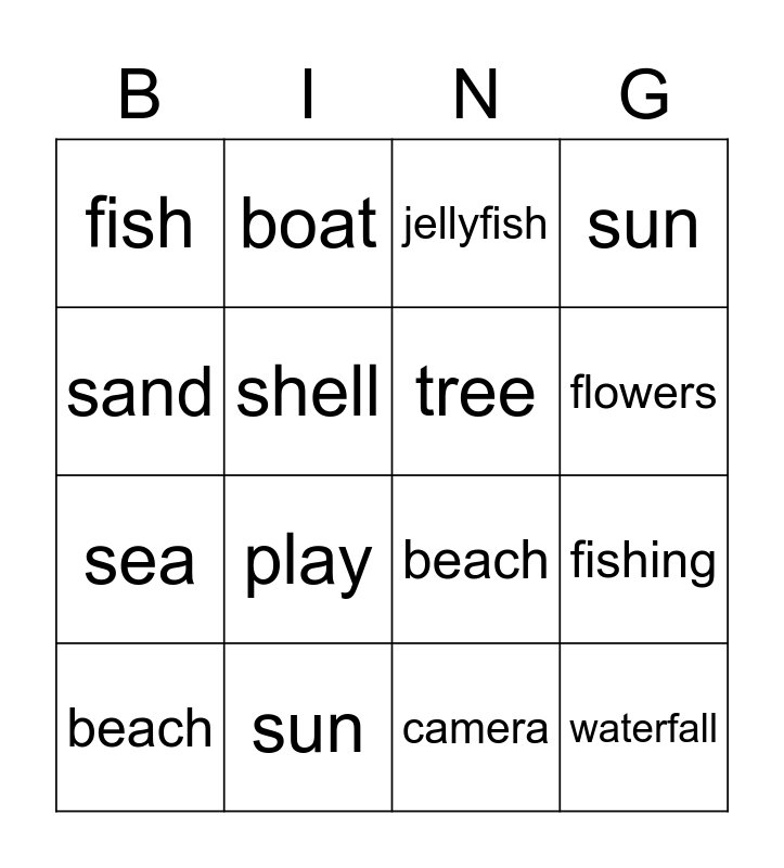 This bingo card has 16 words: sun, fishing, jellyfish, fish, sea, boat, beach, camera, sand, shell, beach, sun, play, flowers, tree and waterfall.