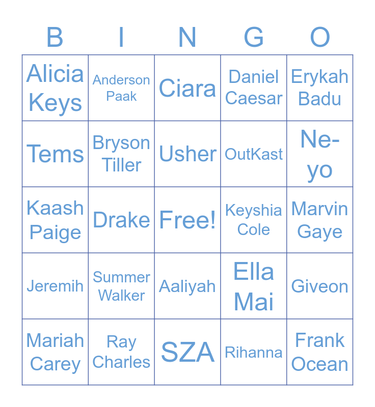 This bingo card has a free space and 48 words: Weeknd, Frank Ocean, Beyonce, SZA, Summer Walker, Steve Lacy, Anderson Paak, Bruno Mars, Tems, Brent Faiyaz, Bryson Tiller, Daniel Caesar, Giveon, Ella Mai, Kehlani, Lucky Daye, Usher, Keyshia Cole, Lauryn Hill, Erykah Badu, Drake, Rihanna, Alicia Keys, OutKast, SoulforReal, Ne-yo, Mariah Carey, Miguel, Aaliyah, Jeremih, Chris Brown, Nelly, Stevie Wonder, Sam Cooke, Ray Charles, Janet Jackson, Prince, Marvin Gaye, D’Angelo, John Legend, Jhene Aiko, PARTYNEXTDOOR, Ciara, T-Pain, Kaash Paige, 6LACK, Tyler the Creator and Kali Uchis.