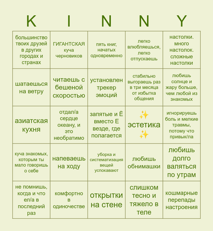 This bingo card has 25 words: напеваешь на ходу, открытки на стене, установлен трекер эмоций, не помнишь, когда и что ел/а в последний раз, настолки. много настолок. сложные настолки, большинство твоих друзей в других городах и странах, шатаешься на ветру, ГИГАНТСКАЯ куча черновиков, ✨ эстетика ✨, уборка и систематизация вещей успокавают, стабильно выгораешь раз в три месяца от избытка общения, азиатская кухня, любишь обнимашки, любишь долго валяться по утрам, читаешь с бешеной скоростью, кошмарные перепады настроения, игнорируешь боль и мелкие травмы, потому что привык/ла, пять книг, начатых одновременно, любишь солнце и жару больше, чем любой из знакомых, отдал/а сердце океану, и это необратимо, запятые и Ё вместо Е везде, где полагается, комфортно в одиночестве, куча знакомых, которым ты мало говоришь о себе, легко влюбляешься, легко отпускаешь and слишком тесно и тяжело в теле.