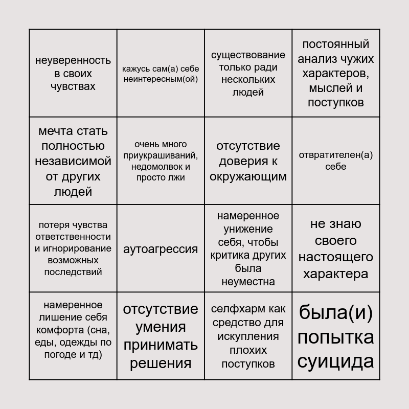 This bingo card has 16 words: отсутствие умения принимать решения, не знаю своего настоящего характера, существование только ради нескольких людей, неуверенность в своих чувствах, потеря чувства ответственности и игнорирование возможных последствий, кажусь сам(а) себе неинтересным(ой), намеренное унижение себя, чтобы критика других была неуместна, селфхарм как средство для искупления плохих поступков, мечта стать полностью независимой от других людей, очень много приукрашиваний, недомолвок и просто лжи, намеренное лишение себя комфорта (сна, еды, одежды по погоде и тд), постоянный анализ чужих характеров, мыслей и поступков, аутоагрессия, отвратителен(а) себе, отсутствие доверия к окружающим and была(и) попытка суицида.