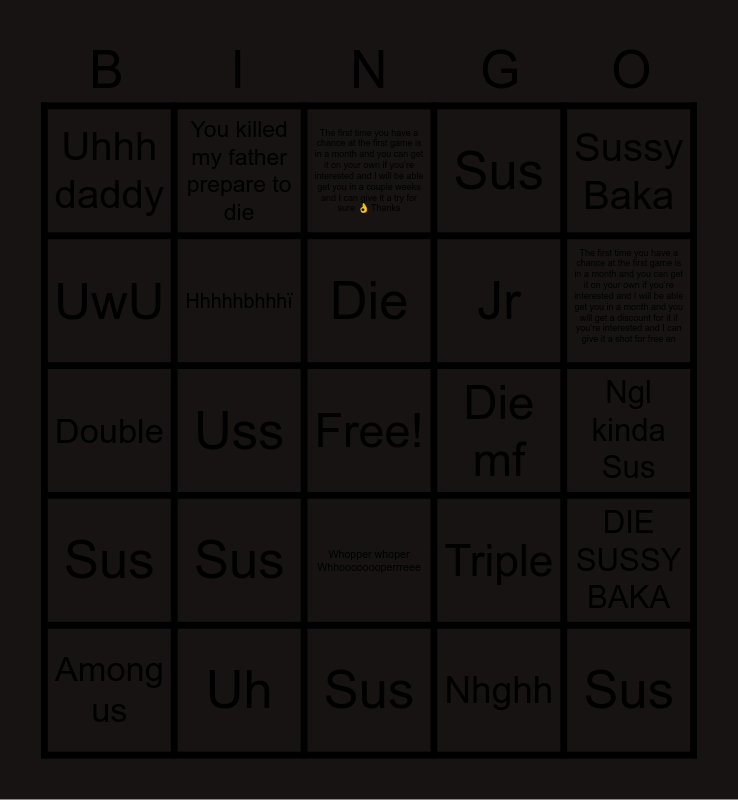 This bingo card has a free space and 24 words: Sus, Uh, Die, Among us, Sussy Baka, Uhhh daddy, UwU, You killed my father prepare to die, Die mf, Whopper whoper Whhoooooooperrreee, Jr, Double, Triple, DIE SUSSY BAKA, Hhhhhbhhhï, Nhghh, Ngl kinda Sus, The first time you have a chance at the first game is in a month and you can get it on your own if you’re interested and I will be able get you in a couple weeks and I can give it a try for sure 👌 Thanks, The first time you have a chance at the first game is in a month and you can get it on your own if you’re interested and I will be able get you in a month and you will get a discount for it if you’re interested and I can give it a shot for free an, Uss, Sus, Sus, Sus and Sus.