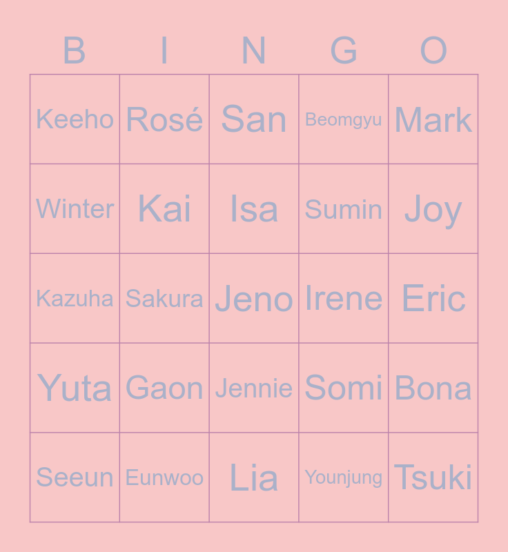 This bingo card has a free space and 24 words: Gaon, Eunwoo, Isa, Seeun, Mark, Keeho, Winter, Rosé, Irene, Jennie, Sumin, Kazuha, Somi, Bona, Kai, Younjung, Eric, San, Joy, Sakura, Tsuki, Yuta, Beomgyu and Lia.