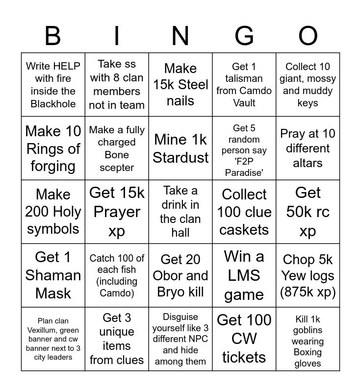 This bingo card has a free space and 24 words: Catch 100 of each fish (including Camdo), Get 3 unique items from clues, Mine 1k Stardust, Plan clan Vexillum, green banner and cw banner next to 3 city leaders, Collect 10 giant, mossy and muddy keys, Write HELP with fire inside the Blackhole, Make 10 Rings of forging, Take ss with 8 clan members not in team, Collect 100 clue caskets, Get 20 Obor and Bryo kill, Get 5 random person say 'F2P Paradise', Make 200 Holy symbols, Win a LMS game, Chop 5k Yew logs (875k xp), Make a fully charged Bone scepter, Get 100 CW tickets, Get 50k rc xp, Make 15k Steel nails, Pray at 10 different altars, Get 15k Prayer xp, Kill 1k goblins wearing Boxing gloves, Get 1 Shaman Mask, Get 1 talisman from Camdo Vault and Disguise yourself like 3 different NPC and hide among them.
