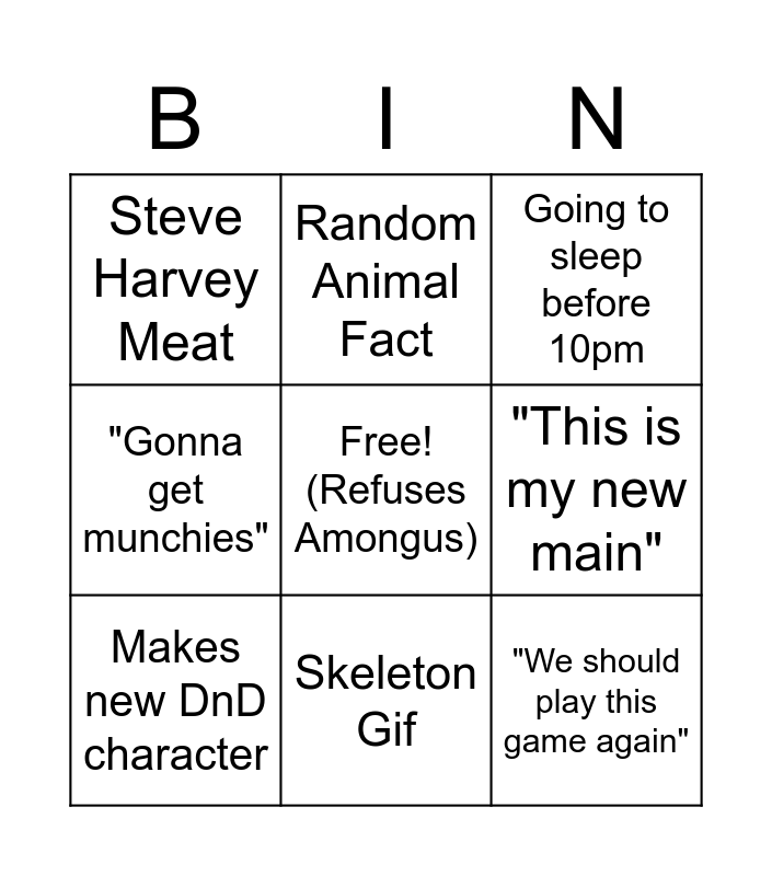 This bingo card has a free space and 8 words: "This is my new main", Going to sleep before 10pm, Random Animal Fact, Makes new DnD character, Steve Harvey Meat, "We should play this game again", "Gonna get munchies" and Skeleton Gif.