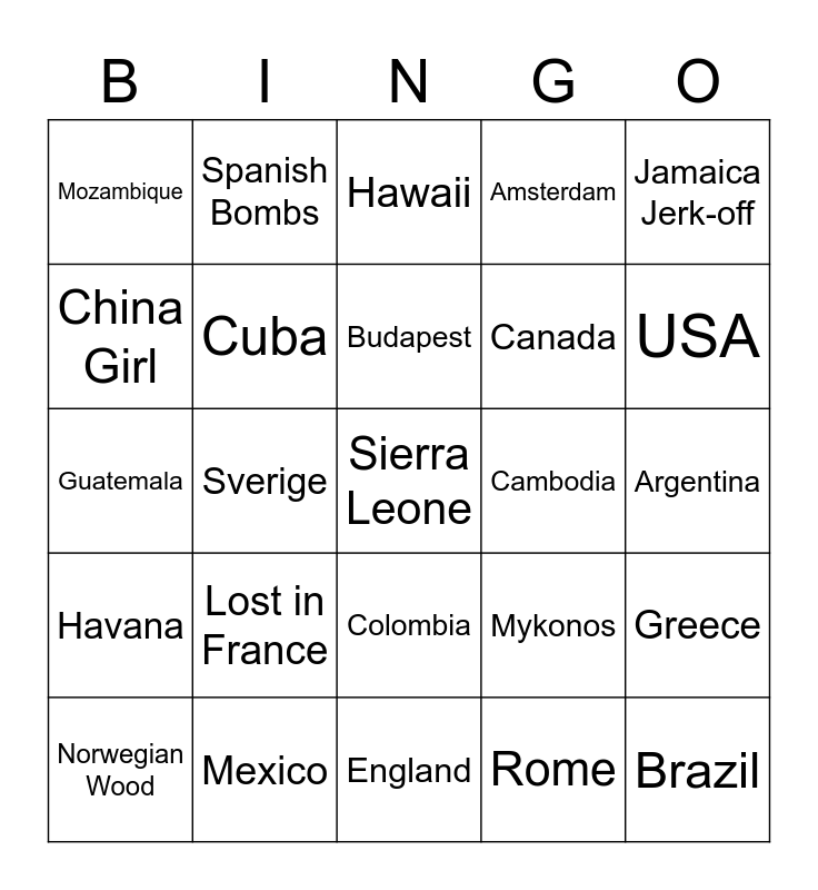 This bingo card has 25 words: Lost in France, England, Budapest, Norwegian Wood, Jamaica Jerk-off, Mozambique, China Girl, Spanish Bombs, Cambodia, Colombia, Canada, Guatemala, Mykonos, Greece, Cuba, Brazil, Argentina, Hawaii, USA, Sverige, Sierra Leone, Mexico, Havana, Amsterdam and Rome.