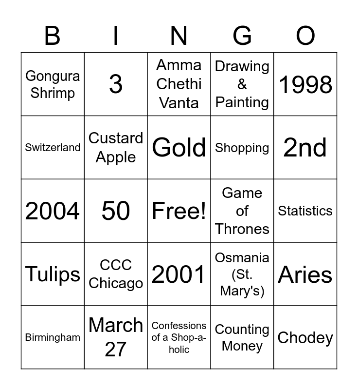 This bingo card has a free space and 34 words: Jangri, Counting Money, 1995, DirecTV, Tulips, Custard Apple, 1998, Birmingham, 3, Gardening, Gold, Amma Chethi Vanta, Computer Science, MBA, Game of Thrones, 2nd, March 27, 2004, CCC Chicago, Osmania (St. Mary's), 2001, Yellow, Gongura Shrimp, Statistics, Confessions of a Shop-a-holic, Chodey, Drawing & Painting, Lakshmi, Shopping, Switzerland, Hyderabad, 50, Aries and NIU.