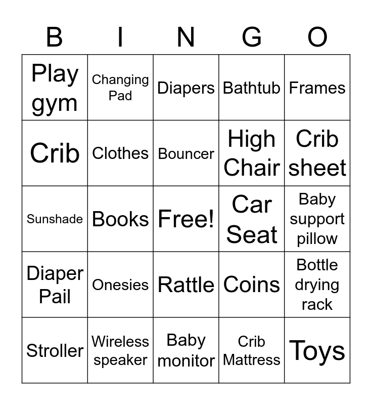 This bingo card has a free space and 28 words: Bottle drying rack, Bottles, High Chair, Crib Mattress, Crib, Diapers, Changing Pad, Diaper Pail, Car Seat, Stroller, Sunshade, Bathtub, Wireless speaker, Baby monitor, Crib sheet, Socks, Onesies, Clothes, Bouncer, Rattle, Play gym, Diaper bag, Toys, Books, Baby support pillow, Coins, Frames and Meal train.