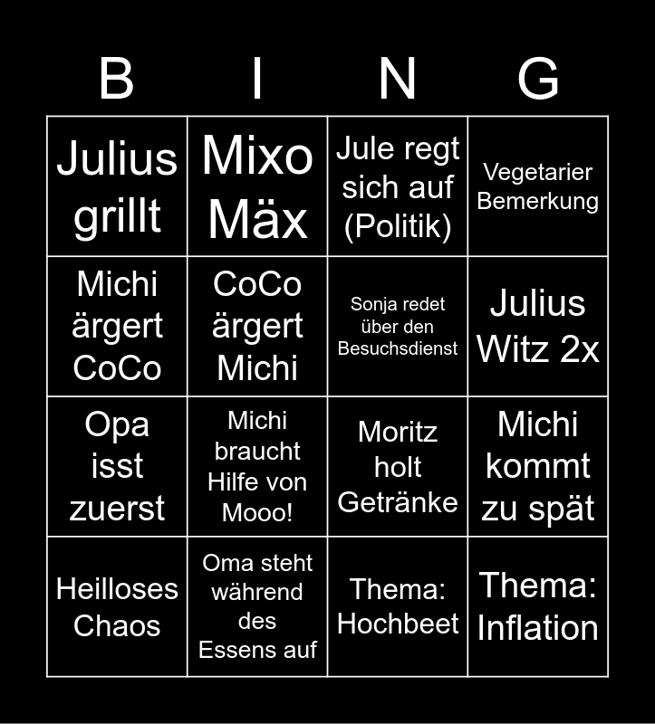 This bingo card has 16 words: Oma steht während des Essens auf, Michi kommt zu spät, Jule regt sich auf (Politik), Julius grillt, Opa isst zuerst, Mixo Mäx, Moritz holt Getränke, Thema: Hochbeet, Michi ärgert CoCo, CoCo ärgert Michi, Heilloses Chaos, Vegetarier Bemerkung, Michi braucht Hilfe von Mooo!, Julius Witz 2x, Sonja redet über den Besuchsdienst and Thema: Inflation.