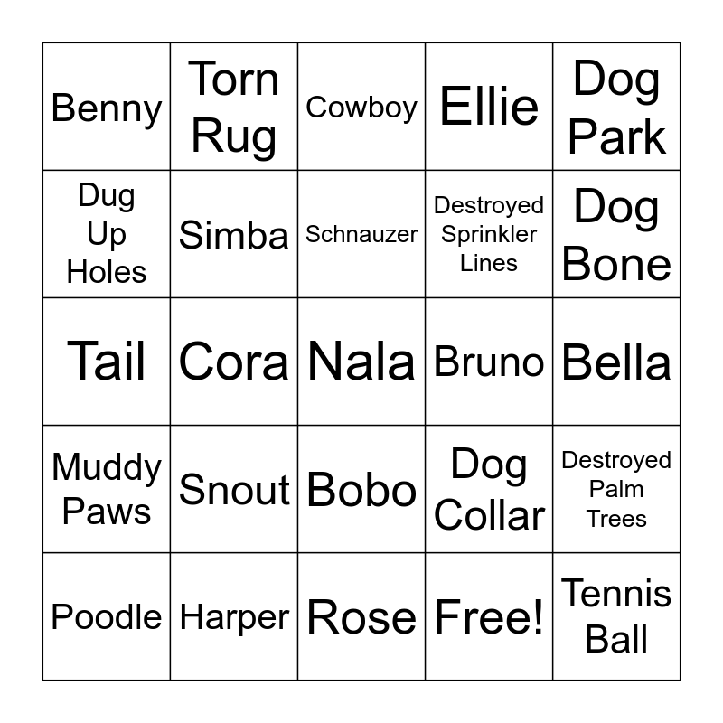 This bingo card has 30 words: Harper, Lexi, Cora, Mia, Benny, Cowboy, Simba, Bobo, Bruno, Rose, Bella, Nala, Free!, Tennis Ball, Dog Bone, Scooby-Doo, Dog Collar, Muddy Paws, Snout, Dog Park, Tail, Ripped Up Bench, Torn Rug, Destroyed Sprinkler Lines, Dug Up Holes, Ellie, Destroyed Palm Trees, Poodle, Schnauzer and Goldendoodle.