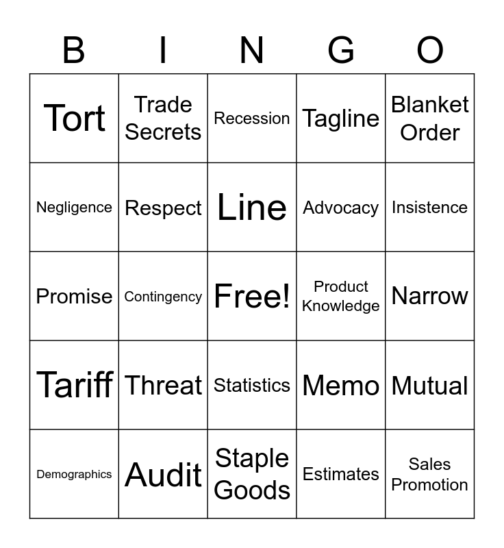 This bingo card has a free space and 25 words: Threat, Staple Goods, Line, Demographics, Blanket Order, Tort, Negligence, Trade Secrets, Product Knowledge, Statistics, Advocacy, Promise, Memo, Mutual, Respect, Insurance, Narrow, Recession, Insistence, Contingency, Sales Promotion, Audit, Tariff, Tagline and Estimates.