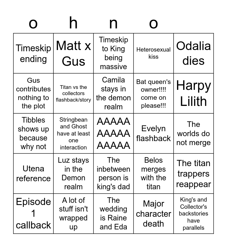 This bingo card has a free space and 24 words: Luz stays in the Demon realm, A lot of stuff isn't wrapped up, Camila stays in the demon realm, Episode 1 callback, Odalia dies, Timeskip ending, Gus contributes nothing to the plot, Matt x Gus, Evelyn flashback, The inbetween person is king's dad, Bat queen's owner!!!! come on please!!!, Tibbles shows up because why not, Belos merges with the titan, The titan trappers reappear, Titan vs the collectors flashback/story, Major character death, The worlds do not merge, Timeskip to King being massive, Harpy Lilith, Stringbean and Ghost have at least one interaction, King's and Collector's backstories have parallels, Utena reference, Heterosexual kiss and The wedding is Raine and Eda.