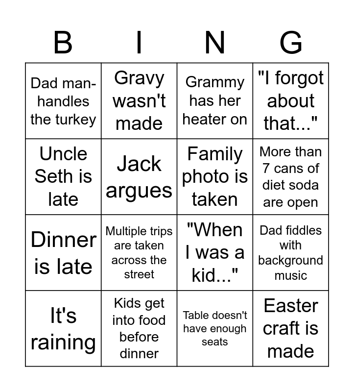 This bingo card has 24 words: Frannie escapes, Someone's drink spills, More than 7 cans of diet soda are open, Dessert is dropped on the floor, Uncle Seth is late, Dad man-handles the turkey, Jack argues, Gravy wasn't made, Kids get into food before dinner, Dad has more than 5 trips to the BR, Dinner is late, "When I was a kid...", Uncle Dale calls, Pa's monitors beep, Family photo is taken, Skippo is played, Table doesn't have enough seats, Grammy has her heater on, Multiple trips are taken across the street, Dad fiddles with background music, It's raining, Easter craft is made, "I forgot about that..." and Candles burn something.