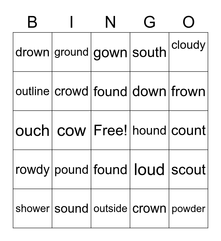 This bingo card has a free space and 24 words: pound, sound, found, shower, cloudy, drown, outline, ground, hound, found, down, ouch, loud, scout, crowd, crown, count, gown, frown, cow, powder, rowdy, south and outside.