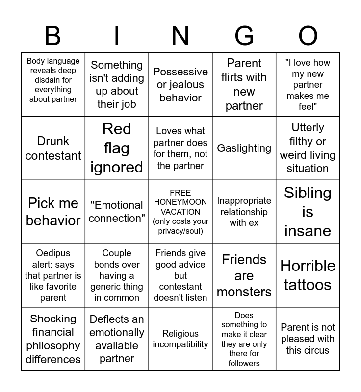 This bingo card has a free space and 29 words: Shocking financial philosophy differences, Lips overform crazy words, "Emotional connection", Subtly shades partner's appearance, Body language reveals deep disdain for everything about partner, Possessive or jealous behavior, Red flag ignored, Couple bonds over having a generic thing in common, Inappropriate relationship with ex, Deflects an emotionally available partner, Sibling is insane, Parent is not pleased with this circus, Religious incompatibility, Does something to make it clear they are only there for followers, Utterly filthy or weird living situation, Deflects a sexually available partner, Friends give good advice but contestant doesn't listen, Oedipus alert: says that partner is like favorite parent, "I love how my new partner makes me feel", Pick me behavior, Friends are monsters, Asking about kids/what city or state to live in after already engaged, Gaslighting, Drunk contestant, Parent flirts with new partner, Something isn't adding up about their job, Horrible tattoos, Loves what partner does for them, not the partner and Drastic hairstyle change suggests the relationship is over.