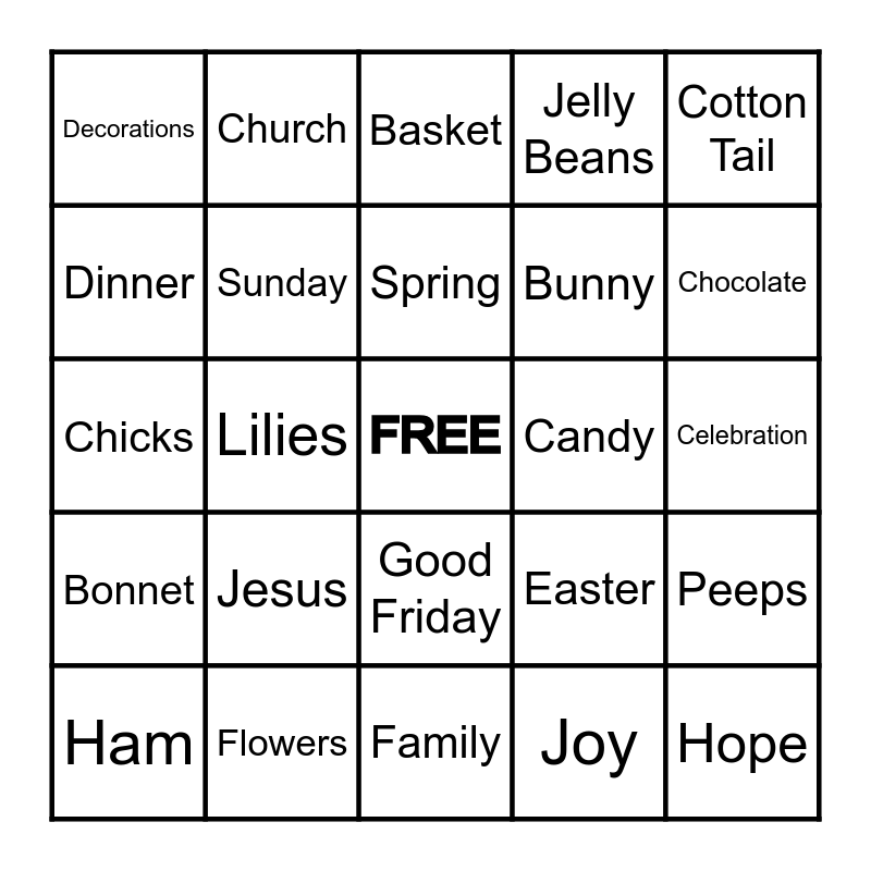 This bingo card has a free space and 27 words: Easter, Egg Hunt, Bunny, Family, Dinner, Basket, Church, Bonnet, Candy, Peeps, Chicks, Jelly Beans, Ham, Flowers, Chocolate, Dye Eggs, Sunday, Spring, Jesus, Decorations, Celebration, Joy, Lilies, Hope, Good Friday, Cotton Tail and Tulips.