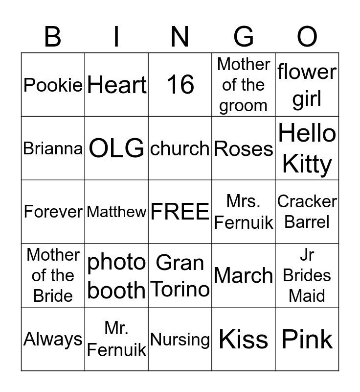 This bingo card has a free space and 24 words: photo booth, Mr. Fernuik, church, Always, flower girl, Pookie, Brianna, Heart, Mrs. Fernuik, Gran Torino, Roses, Forever, March, Jr Brides Maid, OLG, Kiss, Cracker Barrel, 16, Hello Kitty, Matthew, Pink, Mother of the Bride, Mother of the groom and Nursing.