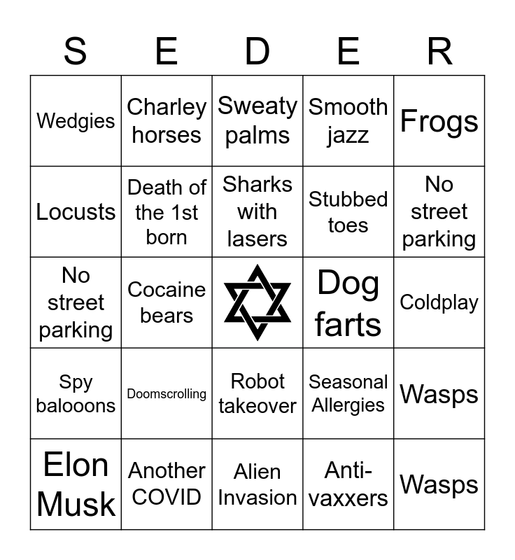 ⚠ This card has duplicate items: Locusts (2), Blood (2), Frogs (2), Lice (2), Insects (2), Boils (2), Hail (2), Darkness (2), Death of the 1st born (2), Cankles (2), Bacne (2), No cell service (2), Necco Wafers (2), Stubbed toes (2), Spy balooons (2), Cocaine bears (2), Another COVID (2), Taco Bell burps (2), Mimes (2), Flat-earthers (2), Wedgies (2), Sharks with legs (2), Sharks with lasers (2), No street parking (2), Smooth jazz (2), Doomscrolling (2), Marjorie Taylor Greene (2), Zombies (2), Charley horses (2), Sweaty palms (2), Dog farts (2), The undead (2), Not listening (2), Robot takeover (2), Coldplay (2), Sharknado (2), Anti-vaxxers (2), Alien Invasion (2), Seasonal Allergies (2), Elon Musk (2), Arby’s (2), Comic sans (2), Serif fonts (2), Wasps (2), Zoom meetings (2), Ebola (2), Karens (2), Focus Groups (2), Stepping on Legos (2)